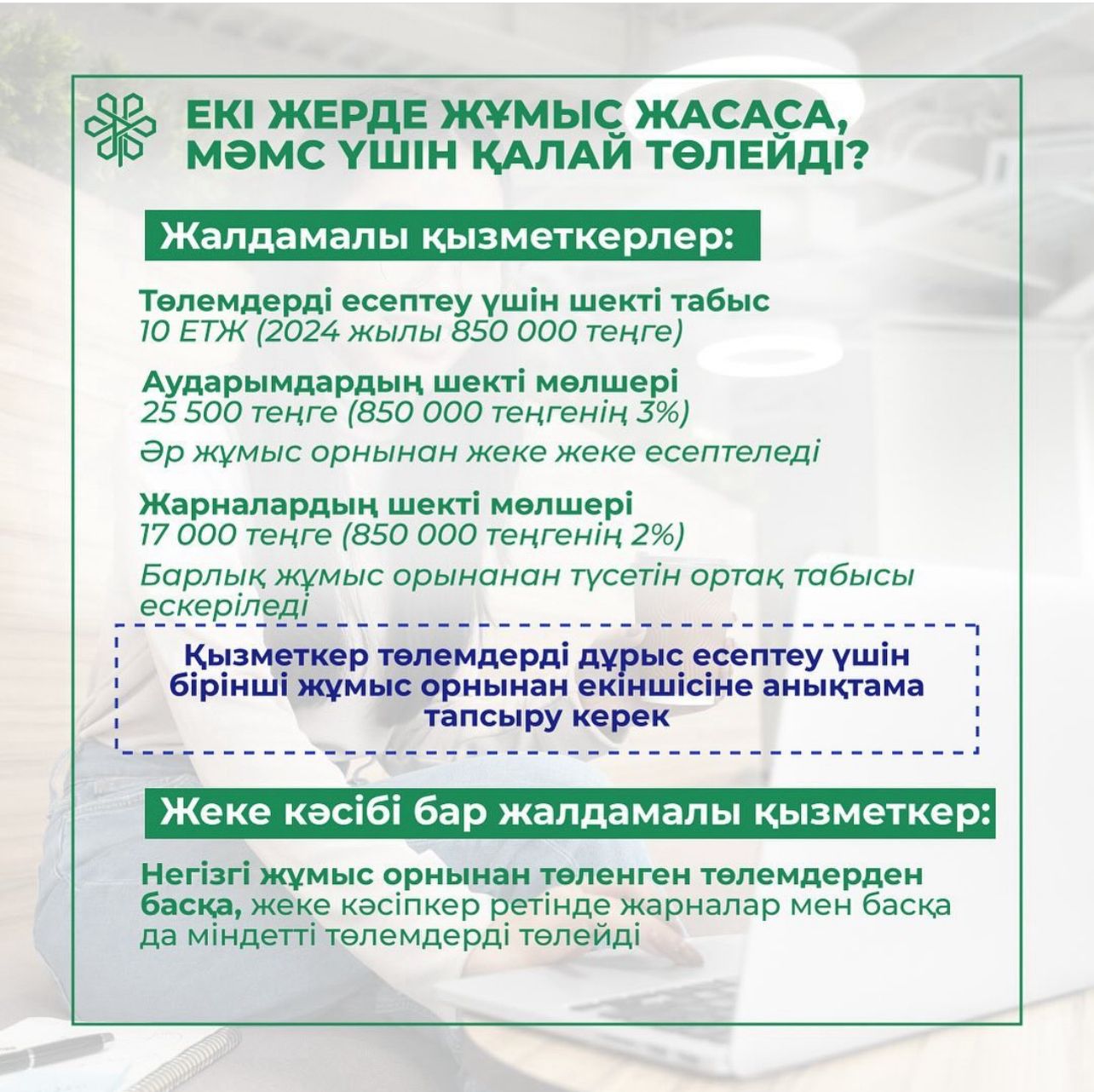 ❗️Егер қызметкер екі және одан да көп ұйымда жұмыс жасаса, онда "Міндетті әлеуметтік медициналық сақтандыру туралы" Заңның 29-бабының 3-тармағына сәйкес жарналарды есептеу үшін қабылданатын ай сайынғы табыс жеке тұлға табысының барлық түрлерінің сомасы бойынша есептелуге тиіс және республикалық бюджет туралы заңда тиісті қаржы жылына белгіленген ең төменгі жалақының 10 еселенген мөлшерінен аспауға тиіс. 2024 жылы төлемдерді есептеу үшін шекті табыс 10 ЕТЖ немесе 850 000 теңгені құрайды.