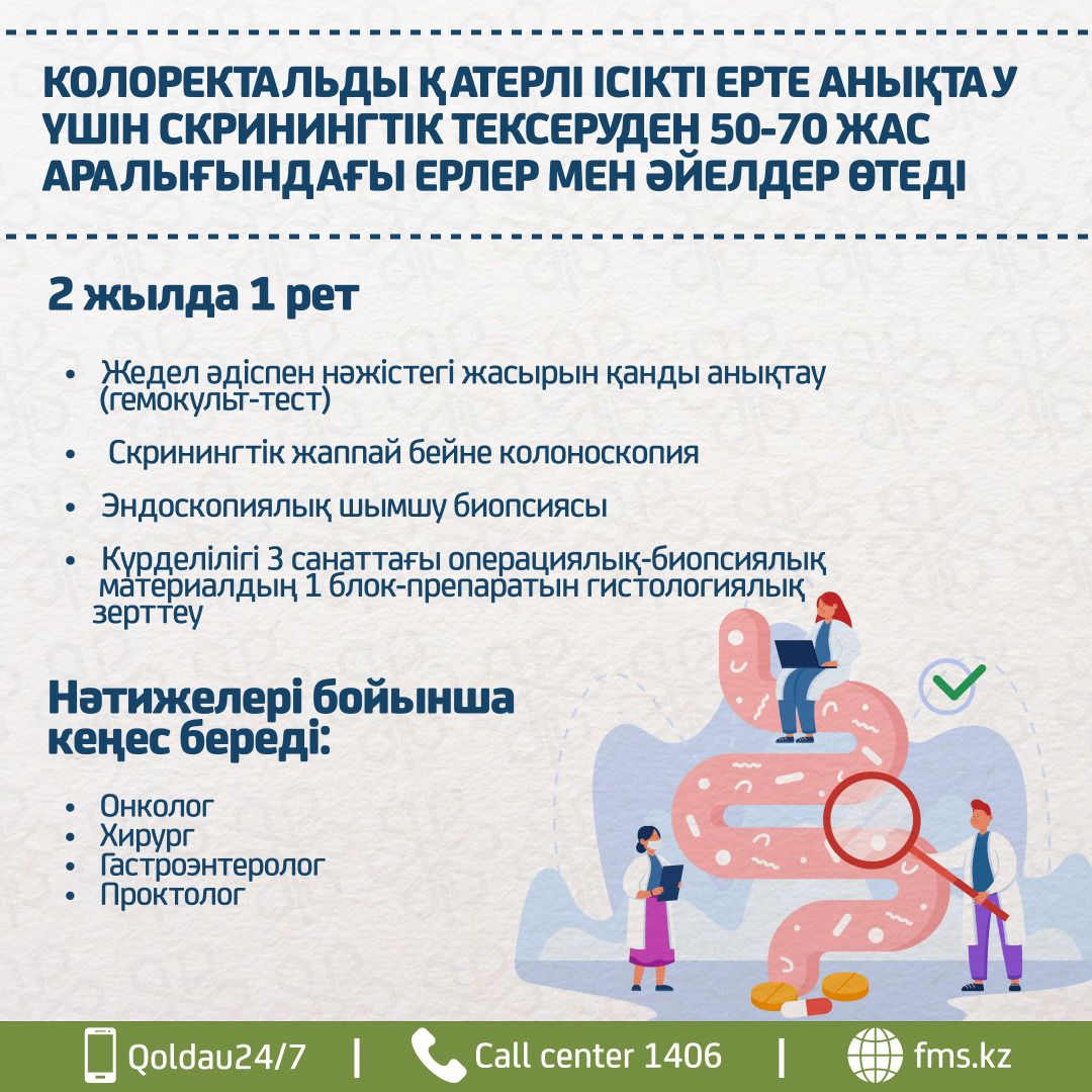 Колоректальды қатерлі ісікті ерте анықтау үшін скринингтік тексеруден 50-70 жас аралығындағы ерлер мен әйелдер 2 жылда 1 рет өтеді