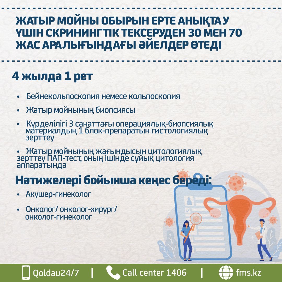 Жатыр мойны обырын ерте анықтау үшін скринингтік тексеруден 30 мен 70 жас аралығындағы әйелдер 4 жылда 1 рет өтеді