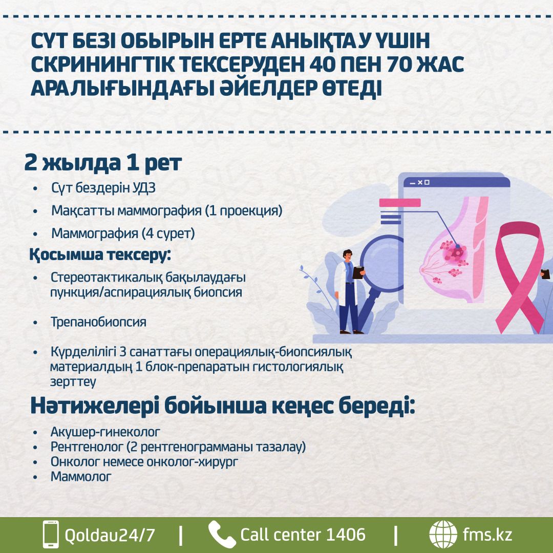 Сүт безі обырын ерте анықтау үшін скринингтік тексеруден 40 пен 70 жас аралығындағы әйелдер 2 жылда 1 рет өтеді