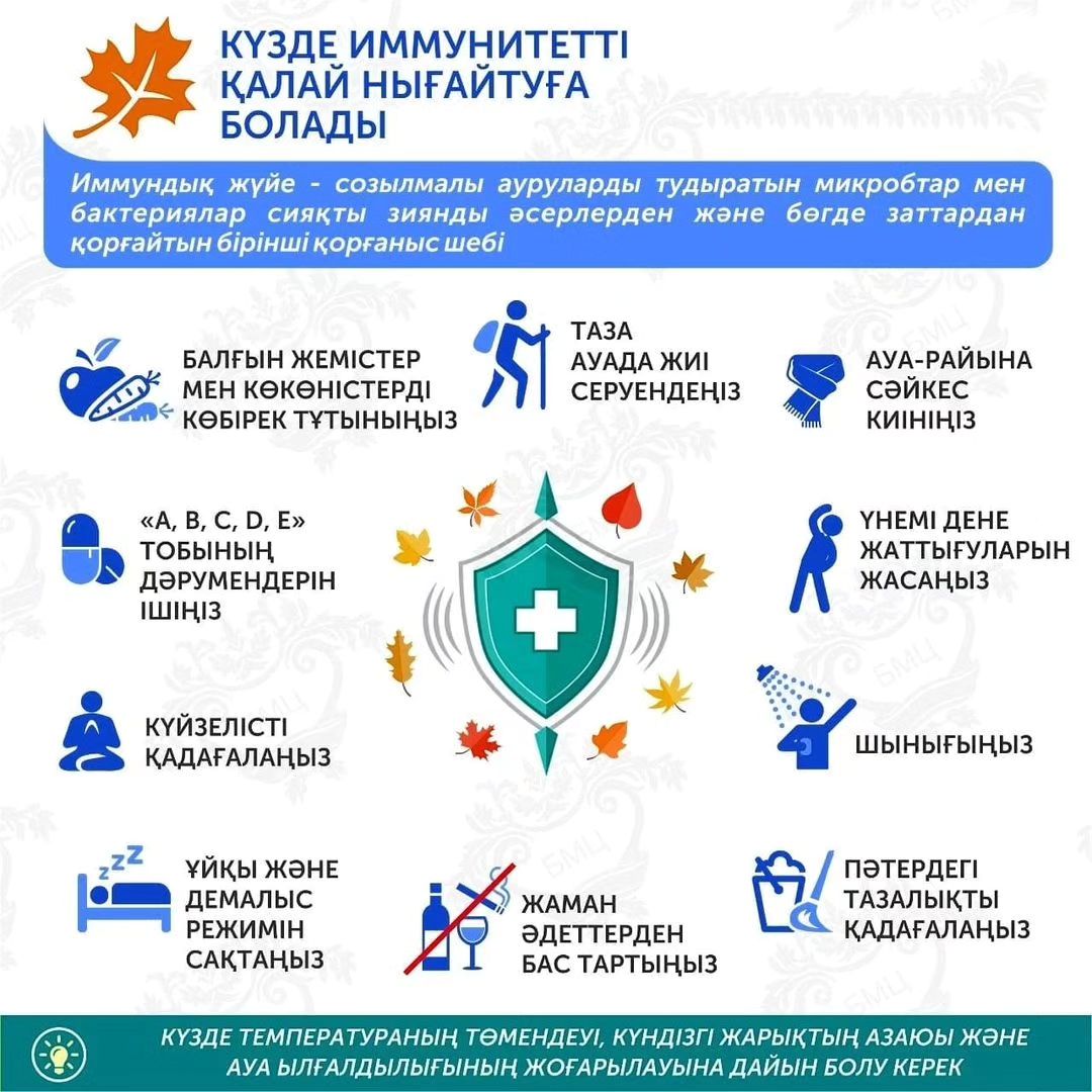 Бүгін біз сіздермен күзде иммунмтетті қалай нығайтуға болатындығы туралы қысқаша инфографикамен бөлісеміз.