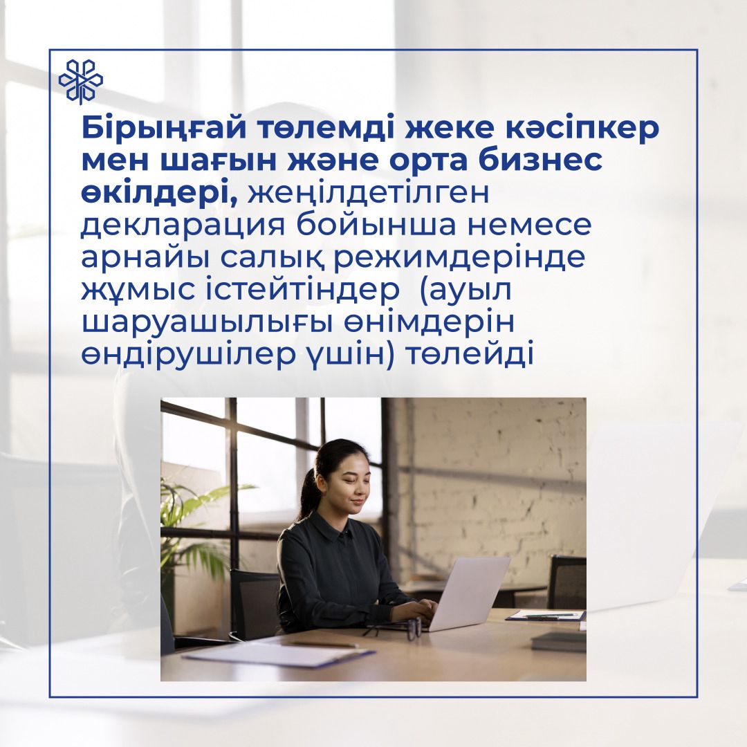 ☝️ Бірыңғай төлемді жеке кәсіпкер мен шағын және орта бизнес өкілдері, жеңілдетілген декларация бойынша немесе арнайы салық режимдерінде жұмыс істейтіндер (ауыл шаруашылығы өнімдерін өндірушілер үшін) төлейді.