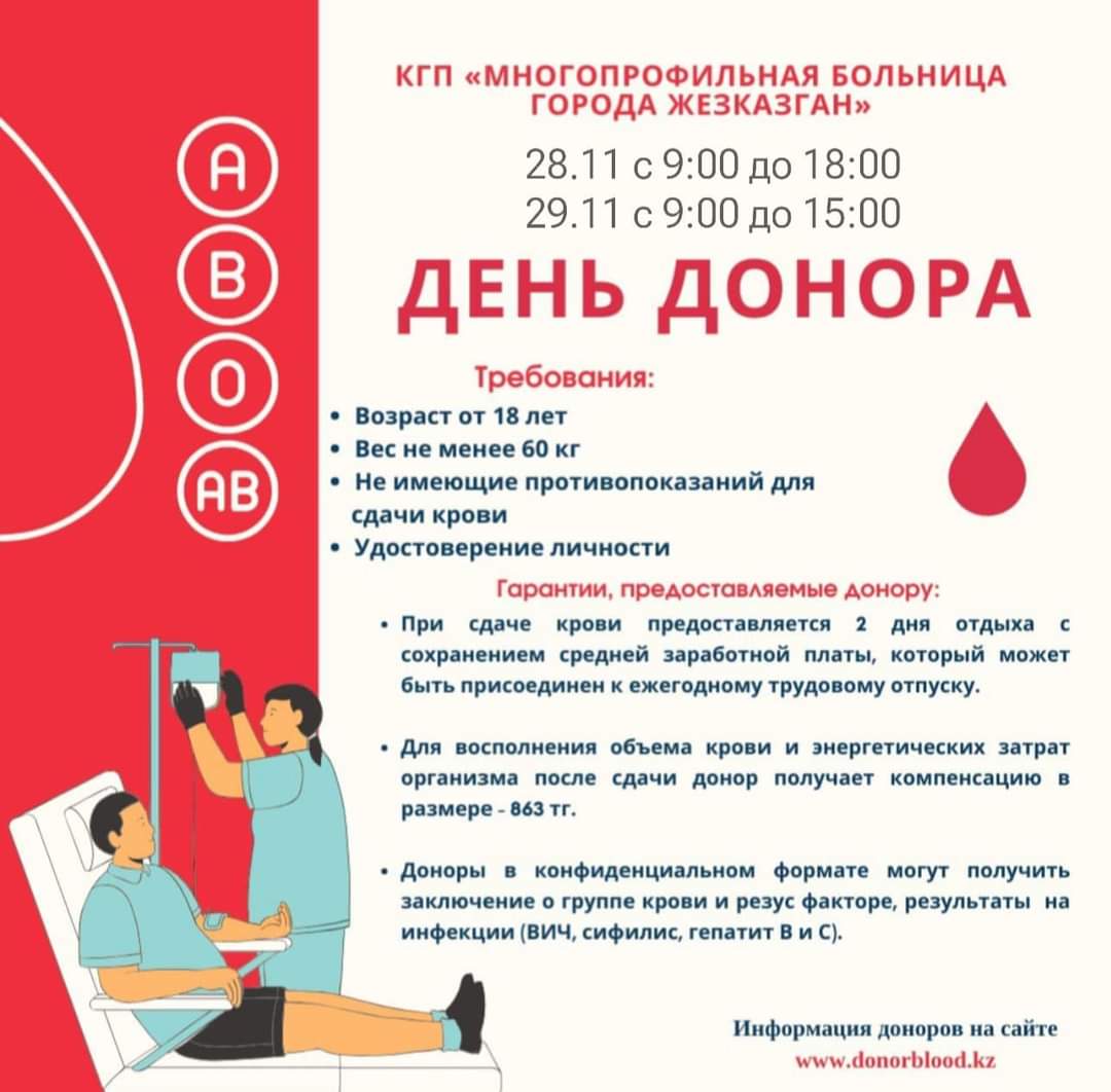 КГП «Областной центр крови» УЗ КО приглашает желающих стать донорами крови на день донора в Многопрофильную больницу г.Жезказган 28-29 ноября.