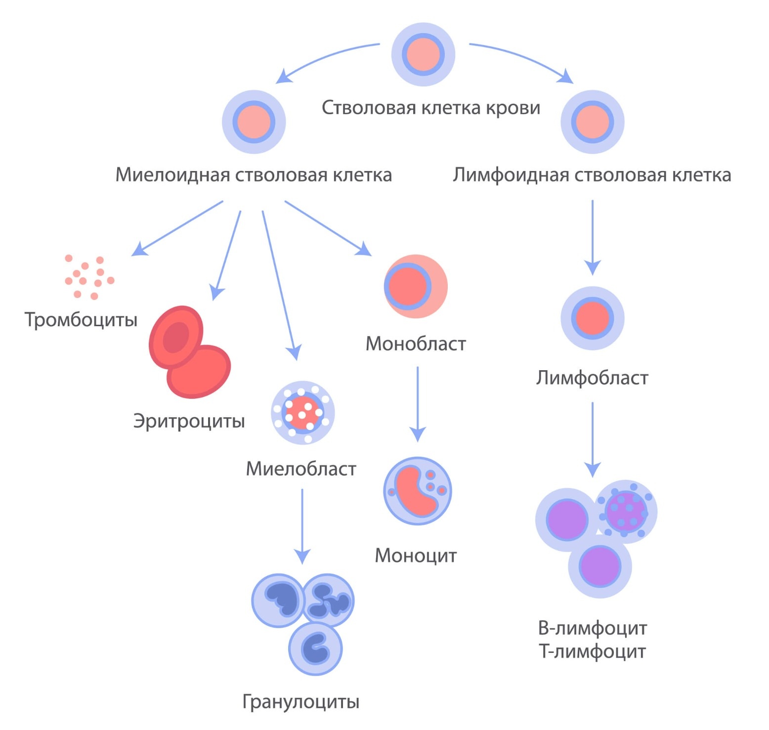 Основных путей для созревания (их еще называют линиями дифференцировки) у стволовой клетки два: миелоидный и лимфоидный. При миелоидном пути созревания из стволовой клетки образуются тромбоциты, эритроциты, гранулоциты (нейтрофилы, эозинофилы и базофилы) и моноциты. При лимфоидном пути созревания из стволовой клетки образуются Т- и В-лимфоциты.